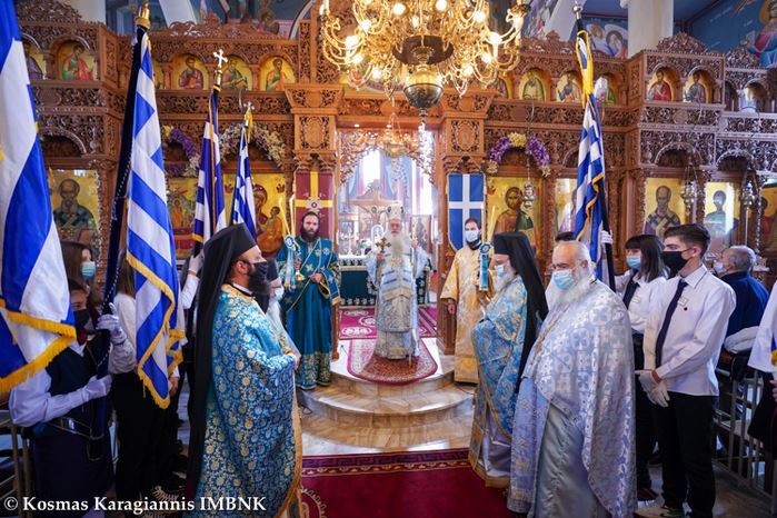 Ἡ σημερινή λαμπρή καί χαρμόσυνη ἡμέρα τῶν Ἐλευθερίων τῆς πόλεώς μας μᾶς καλεῖ νά κάνουμε καί ἐμεῖς τό χρέος μας ἔναντι τοῦ Θεοῦ, τῆς πατρίδος καί τῶν συνανθρώπων μας, ἄν θέλουμε νά εἴμεθα ἄξιοι τῆς ἐλευθερίας πού μέ τόσες θυσίες καί μέ τή βοήθεια τοῦ Θεοῦ καί τῆς Ὑπεραγίας Θεοτόκου, τῆς Ὑπερμάχου Στρατηγοῦ τοῦ Γένους μας, μᾶς χάρισαν οἱ πατέρες μας. Ἄς φανοῦμε ἀντάξιοί τους!