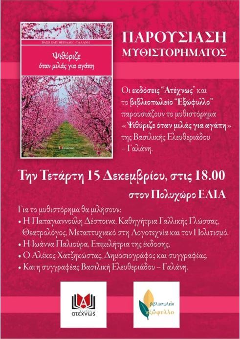 Βέροια Εκδηλώσεις Βέροια / Βιβλιοπαρουσίαση: Βάσω Ελευθεριάδου – Γαλάνη “ψιθύριζε όταν μιλάς για αγάπη”, Τετάρτη 15 Δεκεμβρίου Faretra.info 09/12/2021, 14:05 Share on Facebook Share on Twitter Send with mail Φαρέτρα Βάσω Ελευθεριάδου - Γαλάνη Βιβλίο ΣΧΕΤΙΚΑ ΑΡΘΡΑ Δεν υπάρχουν σχετικά άρθρα.