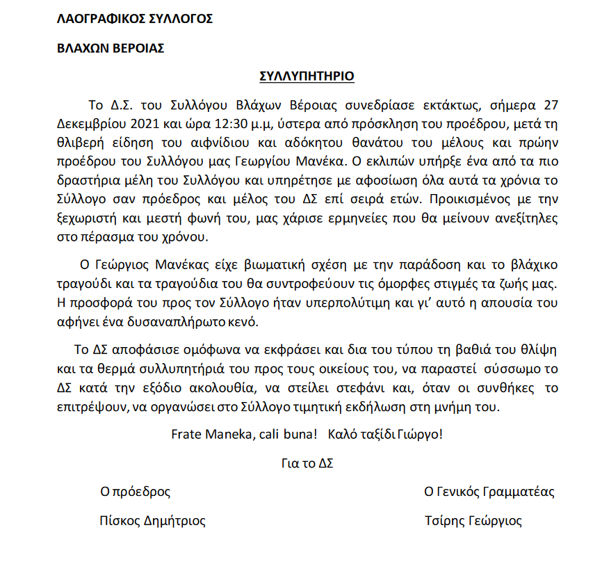 Βέροια Πολιτισμός Συλλυπητήριο του Συλλόγου Βλάχων Βέροιας για τον θάνατο του Γιώργου Μανέκα Faretra.info 27/12/2021, 15:45 Share on Facebook Share on Twitter Send with mail Φαρέτρα Γιώργος Μανέκας θάνατος Σύλλογος Βλάχων Βέροιας Συλλυπητήριο ΣΧΕΤΙΚΑ ΑΡΘΡΑ Δεν υπάρχουν σχετικά άρθρα.