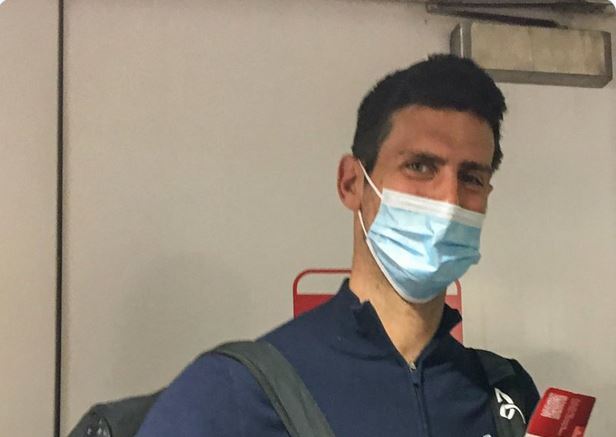 Ο υπ’ αριθμόν ένα τενίστας στην παγκόσμια κατάταξη βγήκε από το αεροσκάφος με δυο σάκους, φορώντας χειρουργική μάσκα, έπειτα από την προσγείωση του αεροσκάφους στο διεθνές αεροδρόμιο του Ντουμπάι στις 05:32 (τοπική ώρα· στις 03:32 ώρα Ελλάδας).
