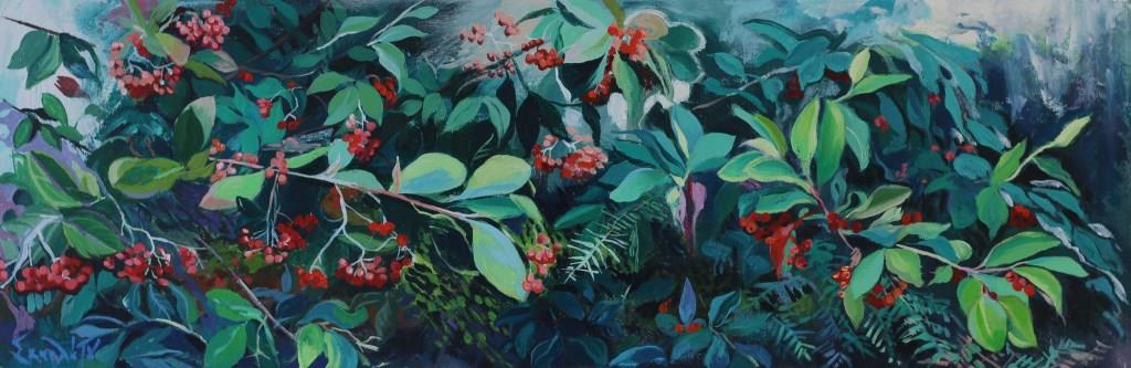 Η φύση, άλλοτε αυτοφυής και άλλοτε σε διάλογο με την ανθρώπινη παρέμβαση είναι το σταθερό «μοντέλο» ή μοτίβο στη νέα σειρά έργων της Θεανώς Σκαρλάτου: Μια σιωπηλή συστάδα δέντρων ή μια μεγεθυμένη λεπτομέρεια από πολύχρωμα φυλλώματα, ή ακόμα η ακύμαντη θάλασσα με μια προβλήτα και κάποια βάρκα να έχει αγκυροβολήσει δίπλα της.