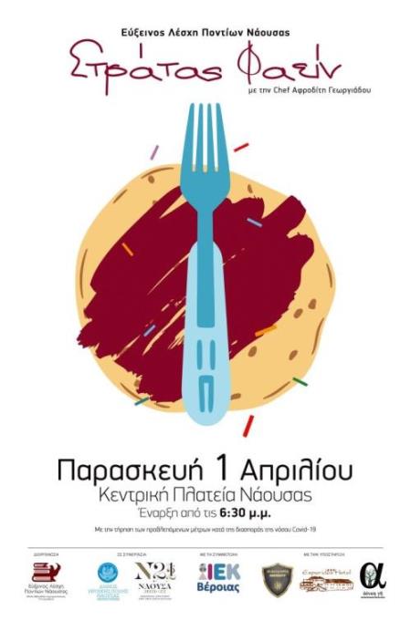 Η Εύξεινος Λέσχη Ποντίων Νάουσας – Εθνική Βιβλιοθήκη Αργυρουπόλεως «Ο Κυριακίδης», διοργανώνει την γαστρονομική εκδήλωση «Στράτας Φαείν», την Παρασκευή 1 Απριλίου 2022 από τις 6:30 το απόγευμα και μετά, στην κεντρική πλατεία της Νάουσας (πλατεία Καρατάσου).