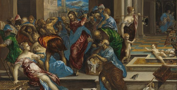 Στο εικαστικό του: “Η εκδίωξη των εμπόρων από το Ναό”, ο Δομήνικος Θεοτοκόπουλος τοποθετεί στο κέντρο της σύνθεσής του τον Ιησού που οργισμένος και κρατώντας μαστίγιο διώχνει τους εμπόρους από το ναό στα Ιεροσόλυμα.