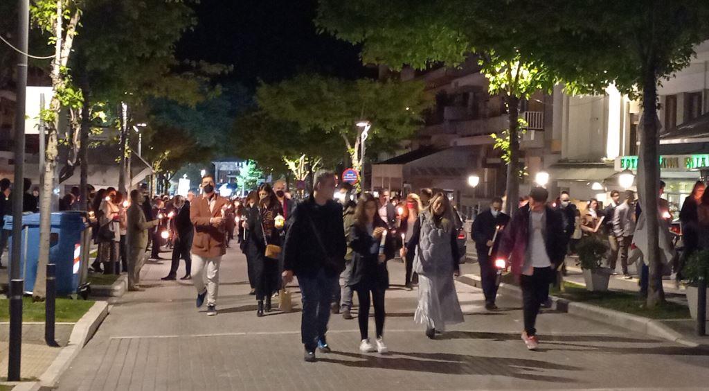 Οι αναστάσιμες λαμπάδες αναμμένες ήδη στα χέρια όλων να τρεμοπαίζουν τη φλόγα τους στο -επιτέλους – ανοιξιάτικο αεράκι, φωτίζοντας τα πρόσωπα, που όλα είχαν ένα χαμόγελο.