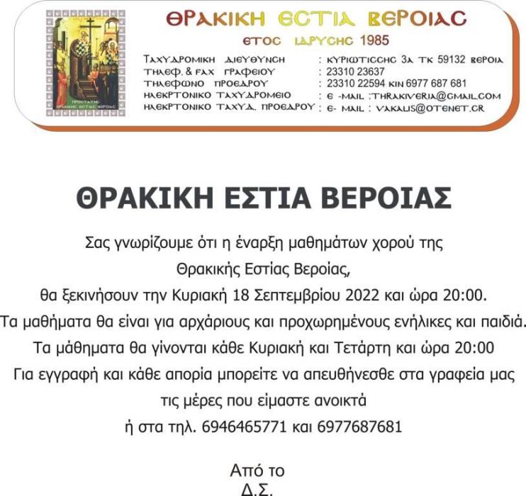 Βέροια Εκδηλώσεις Ξεκινούν τα μαθήματα χορού στη Θρακική Εστία Βέροιας Faretra.info 14/09/2022, 11:35 Share on Facebook Share on Twitter Send with mail Φαρέτρα Θρακική Εστία Βέροιας Χορός ΣΧΕΤΙΚΑ ΑΡΘΡΑ Δεν υπάρχουν σχετικά άρθρα.