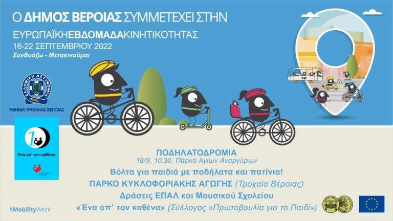 Στο επίκεντρο των δράσεων βρίσκεται το ενδιαφέρον για το περιβάλλον με τη χρήση εναλλακτικών μέσων μετακίνησης, όπως είναι το ποδήλατο. Έτσι στο πανευρωπαϊκό φετινό σύνθημα «Συνδυάζω-Μετακινούμαι» ο Δήμος Βέροιας απαντά με πρόσκληση για Ποδηλατοδρομία, χωρίς διαγωνιστικό χαρακτήρα για παιδιά ΣΤ’ Δημοτικού και άνω και για ενήλικες την Κυριακή 18 Σεπτεμβρίου 2022, ώρα 10:30 π.μ. Σημείο εκκίνησης, Πάρκο Αγ. Αναργύρων (ώρα προσέλευσης 09:30-10:00 π.μ. για δηλώσεις συμμετοχών και υπογραφή υπεύθυνης δήλωσης από γονέα συνοδό).
