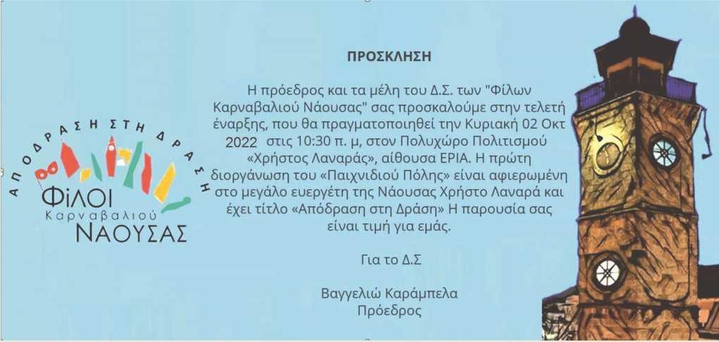 Εκδηλώσεις Νάουσα Νάουσα / Φίλοι Καρναβαλιού: Πρόσκληση στην τελετή έναρξης του “Παιχνιδιού Πόλης” | Κυριακή 2 Οκτωβρίου Faretra.info 27/09/2022, 14:20 Share on Facebook Share on Twitter Send with mail Φαρέτρα Φίλοι Καρναβαλιού Νάουσας ΣΧΕΤΙΚΑ ΑΡΘΡΑ Δεν υπάρχουν σχετικά άρθρα.