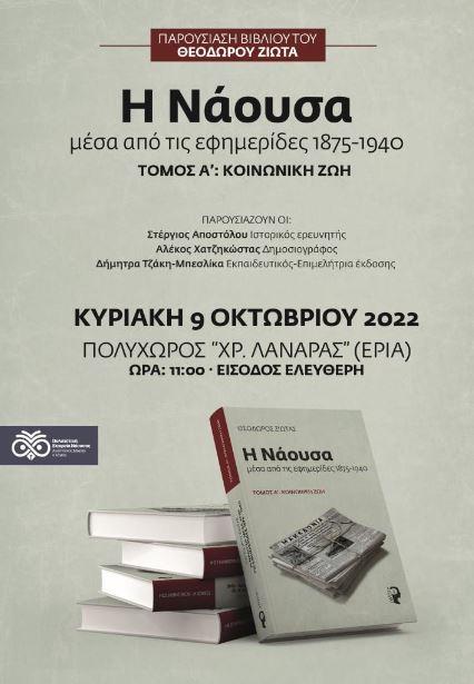 Η Πολιτιστική Εταιρεία Νάουσας «Αναστάσιος Μιχαήλ ο λόγιος» σας προσκαλεί στην επίσημη παρουσίαση του βιβλίου με την έρευνα του Θεόδωρου Ζιώτα, «Η Νάουσα μέσα από τις εφημερίδες, 1875-1940-Α΄τόμος, Κοινωνική ζωή» που εξέδωσε η Πολιτιστική μας Εταιρεία με την οικονομική ενίσχυση του Υπουργείου Πολιτισμού, την Κυριακή 9 Οκτωβρίου 2022, στις 11.00 το πρωί, στην αίθουσα εκδηλώσεων «ΕΡΙΑ» του Πολυχώρου Πολιτισμού «ΧΡΗΣΤΟΣ ΛΑΝΑΡΑΣ».