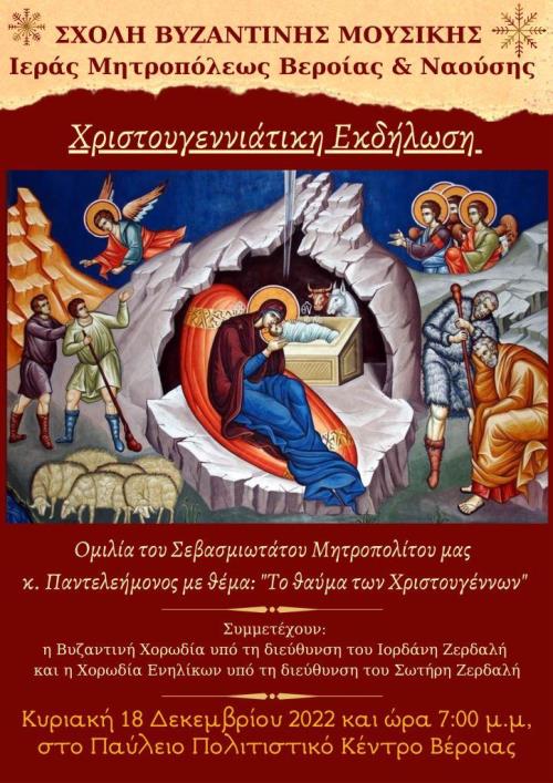 Η Σχολή Βυζαντινής Μουσικής της Ιεράς Μητροπόλεως Βεροίας, Ναούσης και Καμπανίας διοργανώνει Χριστουγεννιάτικη Εκδήλωση, στο Παύλειο Πολιτιστικό Κέντρο στη Βέροια, την Κυριακή 18 Δεκεμβρίου 2022 και ώρα 7:00 μ.μ.