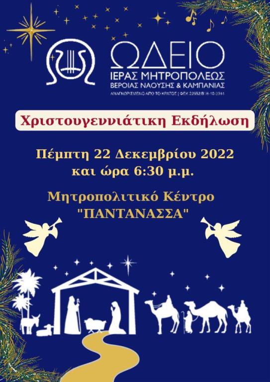 Το Ωδείο της Ιεράς Μητροπόλεως Βεροίας, Ναούσης και Καμπανίας διοργανώνει Χριστουγεννιάτικη Εκδήλωση, στο Μητροπολιτικό Κέντρο “ΠΑΝΤΑΝΑΣΣΑ” στη Νάουσα, την Πέμπτη 22 Δεκεμβρίου 2022 και ώρα 6:30 μ.μ.