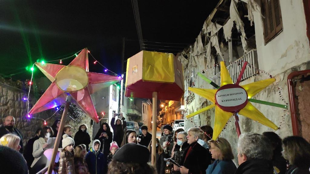 Την Τετάρτη, χειμερινό ηλιοστάσιο με τσουχτερό κρύο , τα μέλη και οι φίλοι της Κίνησης Πολιτών Κυριώτισσας, κατέβηκαν από την αγαπημένη γειτονιά με φωτισμένα λάβαρα, αστέρια και φάτνες της Βηθλεέμ, ψάλλοντας παλιά κάλαντα της πόλης και με το «Ερουρέμ, χαίρε Δέσποινα» των βυζαντινών καλάντων, μπήκαν ως καλεσμένοι που ήταν από την ΕΦΑ στο μουσείο, συνοδευόμενοι από τους γλυκούς ήχους του νάι που έπαιζε ο Θοδωρής, ο διαρκώς στουπί τύπος της ταινίας « Ο Σαϊτσής», σκηνοθετημένη από τον Γιάννη Κ.