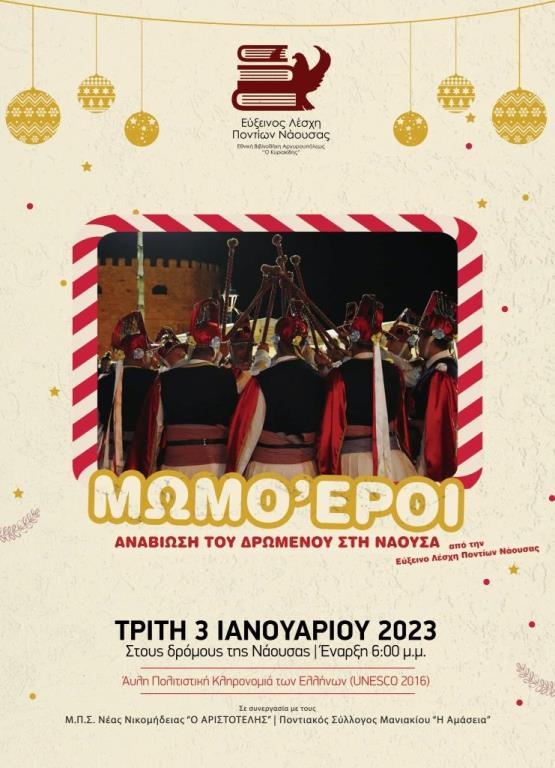 Το έθιμο των Μωμόγερων θα αναβιώσει και φέτος η Εύξεινος Λέσχη Ποντίων Νάουσας την Τρίτη 3 Ιανουαρίου 2023. Με έναρξη στις 6:00 μ.μ., από το κτίριο του σωματείου, οι μωμόγεροι, η Νύφη, ο Διάβολον, ο Γέρον, η Γραία και οι υπόλοιποι θα ξεχυθούν στους κεντρικούς δρόμους της Νάουσας και θα την κάνουν να χορέψει στους ρυθμούς τους.