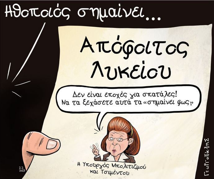 Κριτική στην κυβέρνηση και στην ηγεσία του υπουργείου Πολιτισμού ασκεί με το σκίτσο του ο Δημήτρης Γεωργοπάλης.