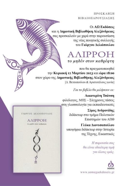 Η Δημοτική Βιβλιοθήκη Αλεξάνδρειας και οι εκδόσεις ΑΩ σάς προσκαλούν στην παρουσίαση της νέας ποιητικής συλλογής του Αλεξανδρινού ποιητή Γιώργου Δελιόπουλου, «Αλιρρόη»