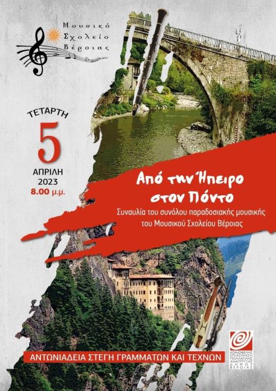 Σας προσκαλούμε στην συναυλία του Συνόλου Παραδοσιακής Μουσικής του Μουσικού Σχολείου Βέροιας η οποία θα πραγματοποιηθεί στην Αντωνιάδεια Στέγη Γραμμάτων & Τεχνών,