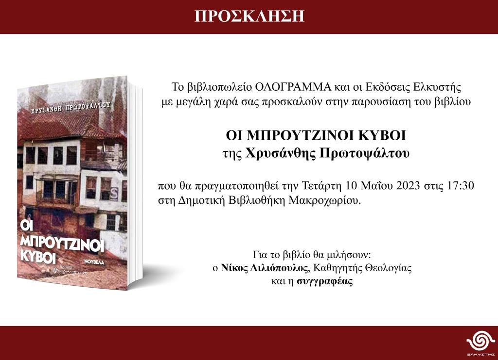 Παρουσίαση Βιβλίου: Χρυσάνθης Πρωτοψάλτου “Οι μπρούτζινοι κύβοι” / Δημοτική Βιβλιοθήκη Μακροχωρίου, Τετάρτη 10 Μαΐου