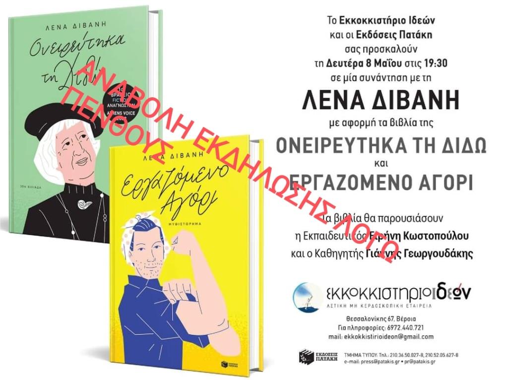 Η συνάντηση με την συγγραφέα Λένα Διβάνη που επρόκειτο να γίνει την Δευτέρα 8 Μαΐου στις 7.30 μ.μ. αναβάλλεται ΛΟΓΩ ΠΕΝΘΟΥΣ