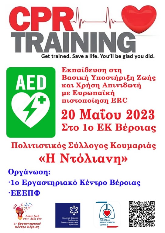 Πραγματοποιήθηκε το Σάββατο 20 Μαΐου στο 1ο Εργαστηριακό Κέντρο Βέροιας, από εθελοντές της Ελληνικής Εταιρείας Επείγουσας Προνοσοκομειακής Φροντίδας (ΕΕΕΠΦ) και την ομάδα Α΄ Βοηθειών του Εργαστηριακού Κέντρου, εκπαίδευση σε μέλη του πολιτιστικού συλλόγου Κουμαριάς «Η Ντόλιανη» και άλλους συμπολίτες μας.