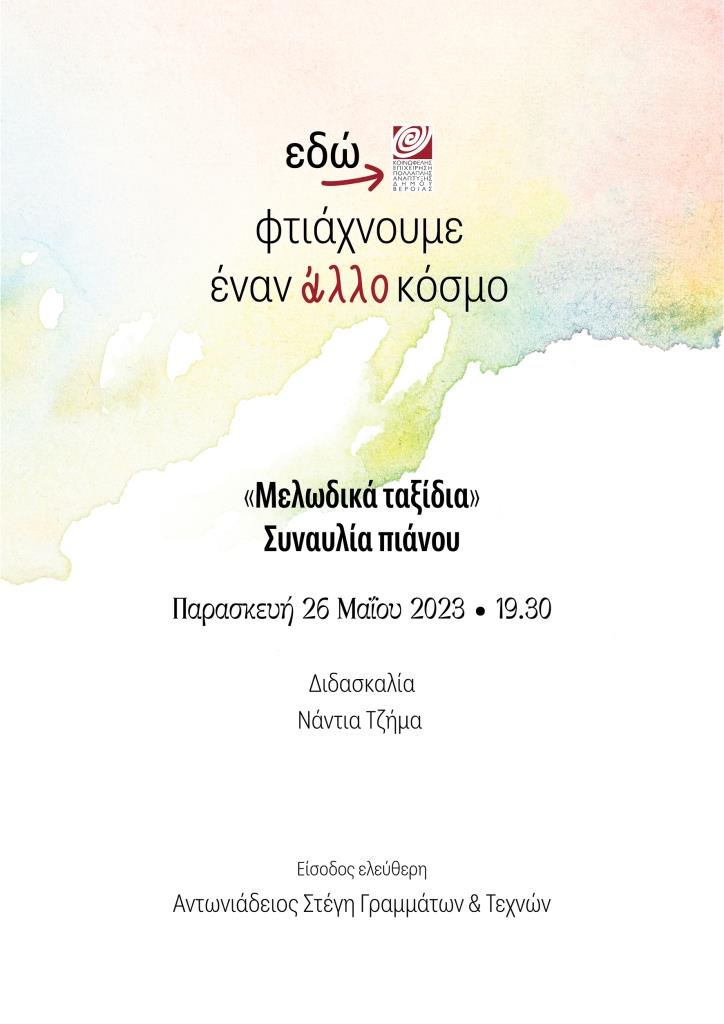 Την Παρασκευή 26 Μαΐου, ώρα 7.30 μ.μ. στην Αντωνιάδειο Στέγη Γραμμάτων και Τεχνών θα πραγματοποιηθεί μαθητική συναυλία πιάνου του τμήματος της Νάντιας Τζήμα καθηγήτρια του Δημοτικού ωδείου Βέροιας. Μικροί και μεγάλοι μαθητές θα μας ταξιδέψουν σε 4 ηπείρους και 25 διαφορετικές χώρες. Θα παρουσιάσουν όμορφες μελωδίες με ιδιαίτερα ακούσματα της κάθε χώρας. Στην συναυλία θα συμμετάσχει και η Ειρήνη Μπέσιου, η οποία αποφοίτησε τον Ιανουάριο 2023 από το τμήμα πιάνου της Νάντιας Τζήμα και πήρε το πτυχίο της με βαθμό άριστα.