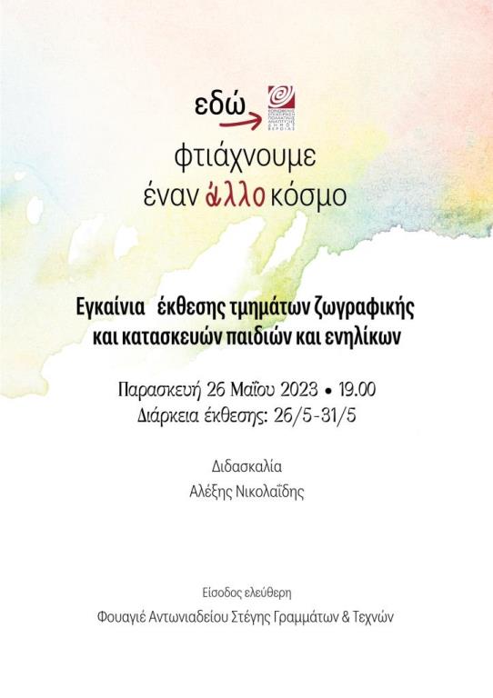 Την Παρασκευή 26 Μαΐου, στις 7 το απόγευμα θα γίνουν τα εγκαίνια της έκθεσης των τμημάτων κατασκευών, ενηλίκων και παιδιών, καθώς και έκθεση ζωγραφικής παιδικών τμημάτων.