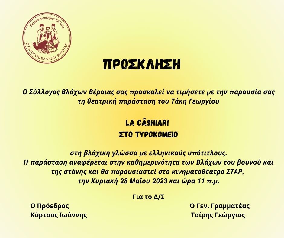 Βέροια Εκδηλώσεις Σύλλογος Βλάχων Βέροιας / θεατρική παράσταση: Τάκη Γεωργίου “Στο τυροκομείο” | Κυριακή 28 Μαΐου Faretra.info 25/05/2023, 09:15 Share on Facebook Share on Twitter Send with mail Φαρέτρα Θέατρο Σύλλογος Βλάχων Βέροιας ΣΧΕΤΙΚΑ ΑΡΘΡΑ Δεν υπάρχουν σχετικά άρθρα.