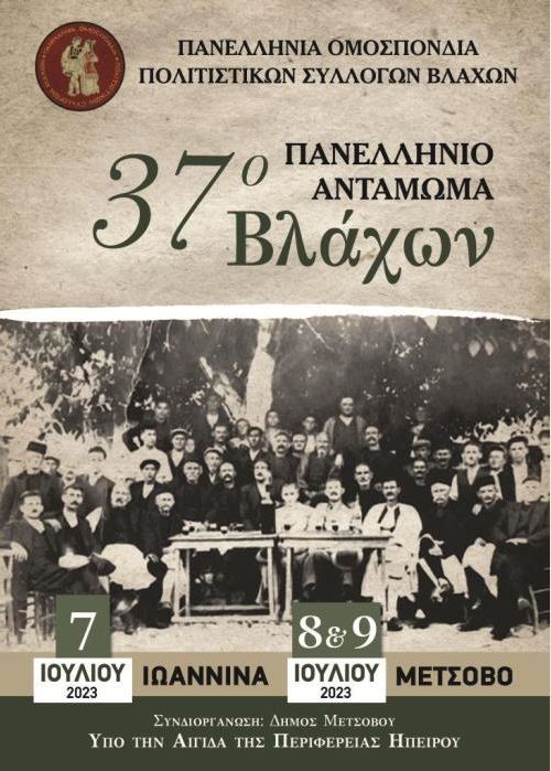 Η Πανελλήνια Ομοσπονδία Πολιτιστικών Συλλόγων Βλάχων διοργανώνει το 37ο Πανελλήνιο Αντάμωμα Βλάχων το τριήμερο 7, 8 και 9 Ιουλίου 2023 στα Ιωάννινα και το Μέτσοβο.Συνδιοργάνωση: Δήμος Μετσόβου – Υπό την αιγίδα της Περιφέρειας Ηπείρου.