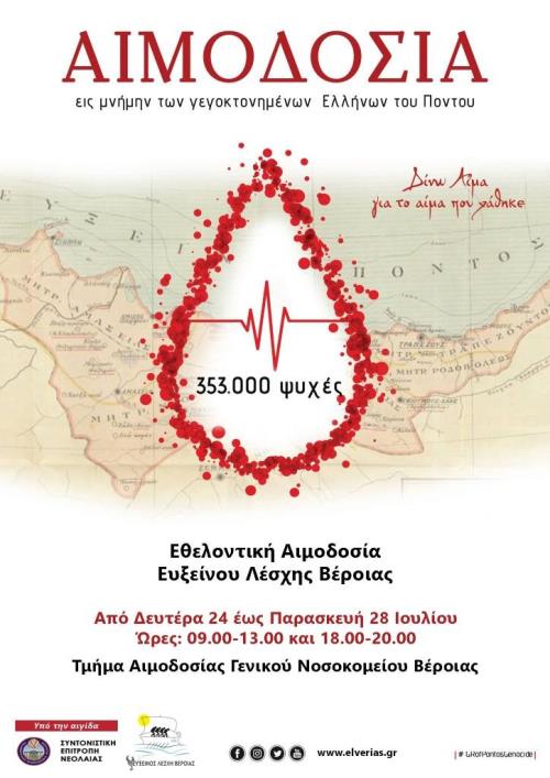 Η Εύξεινος Λέσχη Βέροιας στα πλαίσια της πανελλαδικής αιμοδοσίας της Συντονιστικής Επιτροπής Νεολαίας της Παμποντιακής Ομοσπονδίας Ελλάδος με τίτλο «Δίνω αίμα για το αίμα που χάθηκε», αφιερωμένη στη μνήμη των γενοκτονημένων προγόνων μας, καλεί τα μέλη και τους φίλους της να συμμετέχουν στην αιμοδοσία που θα διοργανώσει σε συνεργασία με το Γ.Ν. Βέροιας από Δευτέρα 24 έως και Παρασκευή 28 Ιουλίου 2023.