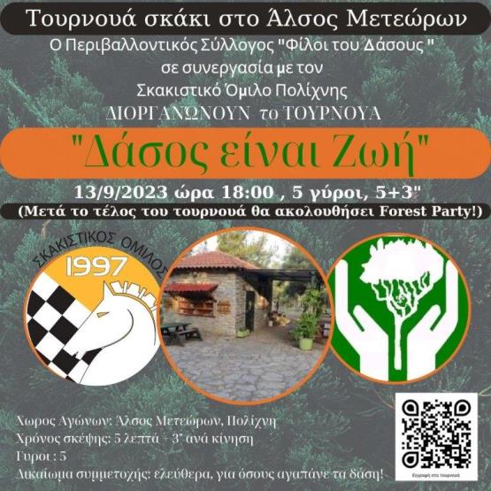 Με κεντρικό σύνθημα το “Δάσος είναι Ζωή” ο Σκακιστικός Όμιλος Πολίχνης και ο Περιβαλλοντικός Σύλλογος οι Φίλοι του Δάσους συνδιοργανώνουν ένα πρωτότυπο απογευματινό τουρνουά σκάκι στην ύπαιθρο.