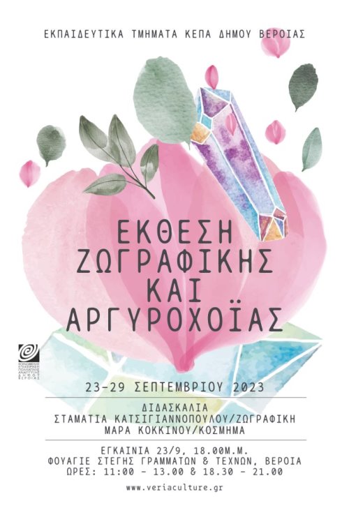 Η ΚΕΠΑ Δήμου Βέροιας προσκαλεί τους φίλους της τέχνης στα εγκαίνια της έκθεσης δημιουργιών των μαθητών των τμημάτων ζωγραφικής ενηλίκων, αργυροχοΐας ενηλίκων & εικαστικού κοσμήματος παιδιών. Οι καθηγήτριες και μαθητές τους σας περιμένουν να σας «ταξιδέψουν» στα μονοπάτια της τέχνης & της δημιουργίας στο Φουαγιέ Αντωνιαδείου Στέγης Γραμμάτων και Τεχνών.