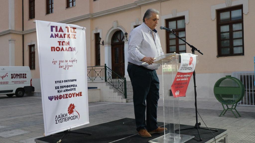 Από το βήμα αυτής της τελευταίας μας προεκλογικής συγκέντρωσης θα ήθελα να απευθύνω ένα πλατύ ενωτικό κάλεσμα συμπόρευσης, στήριξης και ψήφου σε κάθε δημότη και δημότισσα, σε όλους εκείνους που βλέπουν τα προβλήματα να παραμένουν άλυτα και οι ανάγκες τους να ποδοπατιούνται από όλους αυτούς που βάζουν τις ζωές μας και τις λαϊκές ανάγκες στο ζύγι, στη λογική κόστους – οφέλους, που τόσο ακριβά την πλήρωσε και την πληρώνει ο λαός μας.