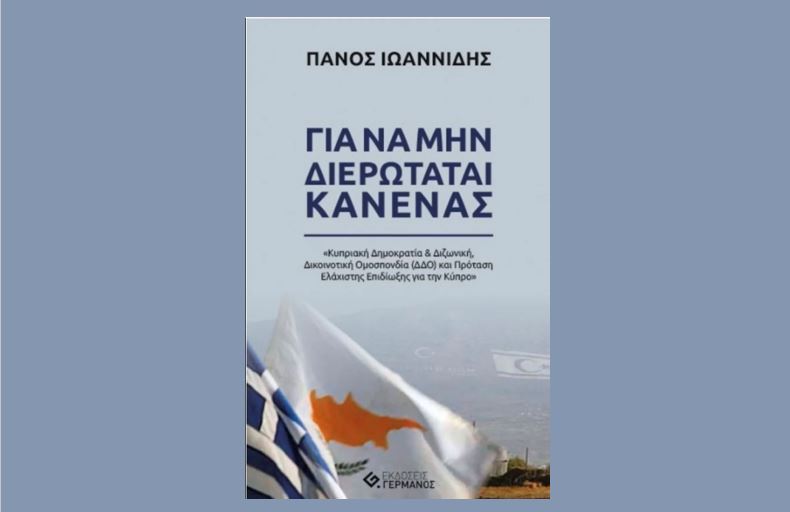 Κυκλοφόρησε πολύ πρόσφατα ένα μικρό μόλις 30 σελίδων βιβλίο του αγαπητού νομικού Πάνου Ιωαννίδη με τον τίτλο « ΓΙΑ ΝΑ ΜΗΝ ΔΙΕΡΩΤΑΤΑΙ ΚΑΝΕΝΑΣ» με τον υπότιτλο «Κυπριακή Δημοκρατία & Διζωνική, Δικοινοτική Ομοσπονδία (ΔΔΟ) και Πρόταση Ελάχιστης Επιδίωξης για την Κύπρο». Εκδόσεις ΓΕΡΜΑΝΟΣ (Θεσσαλονίκη) πρώτη έκδοση Σεπτέμβριος 2023.