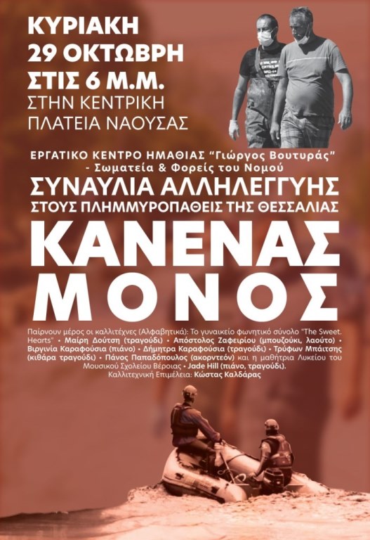 Μεγάλη συναυλία αλληλεγγύης προς τους πλημμυροπαθείς της Θεσσαλίας πραγματοποιεί το Εργατικό Κέντρο Ημαθίας , σωματεία και φορείς του Νομού την Κυριακή 29 Οκτώβρη στις 6μμ στη Κεντρική Πλατεία Νάουσας με τη συμμετοχή σημαντικών καλλιτεχνών του Νομού μας.
