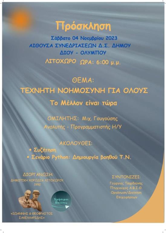 Εκδηλώσεις Λιτόχωρο / εκδήλωση: “Τεχνητή Νοημοσύνη για όλους” / Σάββατο 4 Νοεμβρίου Faretra.info 04/11/2023, 09:20 Share on Facebook Share on Twitter Send with mail Φαρέτρα Λιτόχωρο ΣΧΕΤΙΚΑ ΑΡΘΡΑ Δεν υπάρχουν σχετικά άρθρα.