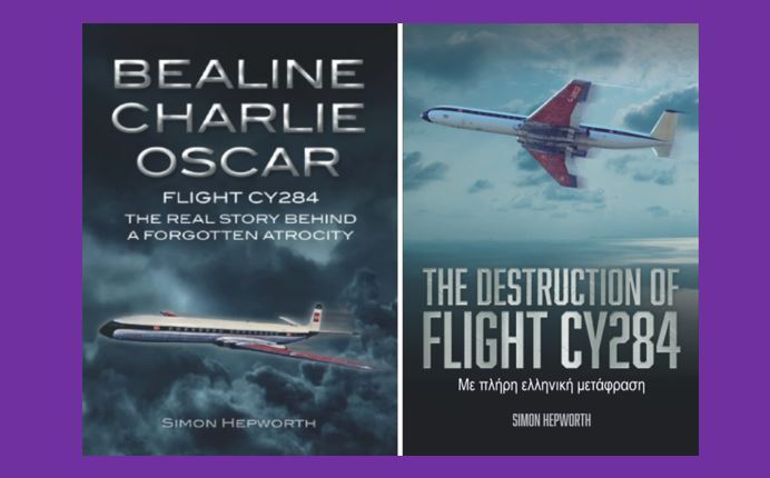 «Bealine Charlie Oscar, Πτήση 284 Η Πραγματική Ιστορία πίσω από μια Ξεχασμένη Θηριωδία» – με την αυτούσια φωτογραφία του αεροπλάνου. Το βιβλίο που χρησιμοποίησε και η Αστυνομική Αναθεώρηση.