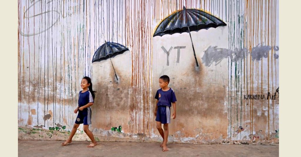 Τελευταίο ταξίδι στην Καμπότζη και δυο παιδιά παίζουν ανέμελα κάτω από δυο ζωγραφισμένες ομπρέλες. Η φαντασία και η τέχνη όχημα της παιδικής αθωότητας!
