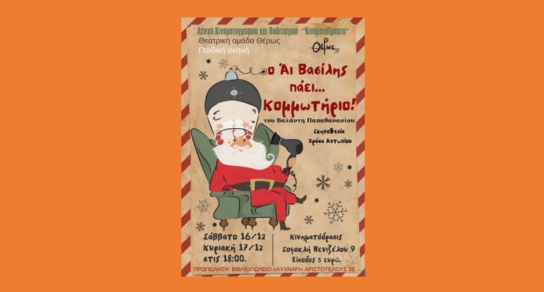 Τα Χριστούγεννα καταφτάνουν και η Θεατρική ομάδα «Θέρως» της «Κινηματόδρασις» ανυπομονεί να συναντήσει τους μικρούς της φίλους, στην θεατρική παράσταση « O Άι Βασίλης πάει κομμωτήριο» μια κωμωδία του Βαλάντη Παπαθανασίου σε σκηνοθεσία Χρύσας Αντωνίου.