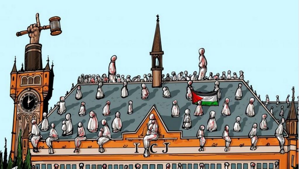 Τα σκίτσα σήμερα εστιάζουν στην ελπίδα των Παλαιστινίων για δικαίωση στη Χάγη χάρη σε ένα κράτος όπως η Νότια Αφρική, η οποία γνωρίζει από καταπίεση και απαρτχάιντ.