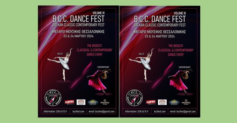 Σας καλωσορίζουμε στο μεγαλύτερο event κλασικού και σύγχρονου χορού. To B.C.C. Festival (Balkan Classic Contemporary Festival), που τελεί υπό την αιγίδα της UNESCO Τεχνών, Λόγου και Επιστημών και διοργανώνεται για τρίτη φορά στη Θεσσαλονίκη, θα λάβει χώρα το διήμερο 23 και 24 Μαρτίου 2024, στο Μέγαρο Μουσικής Θεσσαλονίκης (αίθουσα Αιμίλιος Ριάδης).