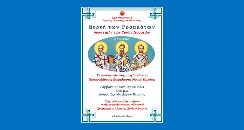 Η Ιερά Μητρόπολη Βεροίας, Ναούσης και Καμπανίας και η Διεύθυνση Δευτεροβάθμιας Εκπαίδευσης Ημαθίας, τιμώντας το έργο και την πολύχρονη προσφορά των αφυπηρετησάντων εκπαιδευτικών καθώς και Διοικητικών υπαλλήλων της Δ.Δ.Ε. Ημαθίας, συνδιοργανώνουν τελετή βράβευσής τους και εορταστική εκδήλωση στις 27 Ιανουαρίου 2024 και ώρα 18:00 στον χώρο Τεχνών του Δήμου Βέροιας, με αφορμή την μνήμη των Αγίων Τριών Ιεραρχών.