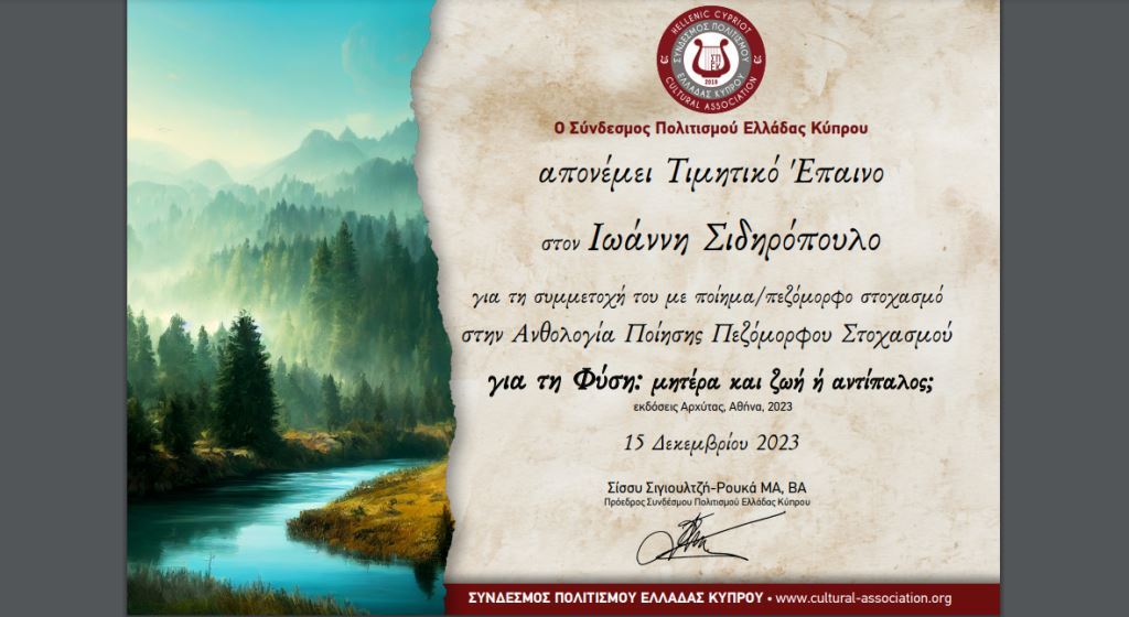 Ο συμπολίτης μας Γιάννης Σιδηρόπουλος, συμμετέχοντας σε λογοτεχνικό διαγωνισμό του ΣΠΕΚ, (Συνδέσμου Πολιτισμού Ελλάδας Κύπρου), με θέμα “Φύση, μητέρα και ζωή ή αντίπαλος;” και κερδίζοντας τιμητικό έπαινο, μας έστειλε τη διάκρισή του.