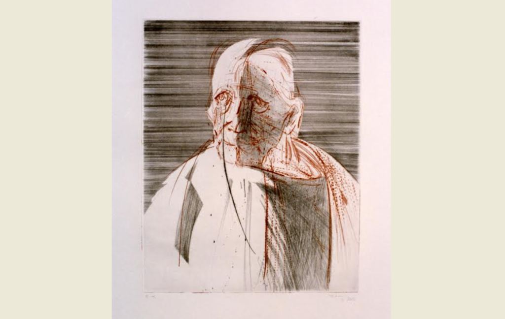 1. ΧΡΟΝΗΣ ΜΠΟΤΣΟΓΛΟΥ, Αυτοπροσωπογραφία, 1997, Χαλκογραφία με επιζωγράφιση (μαύρη τεχνική σε τονική οξυγραφία, ξηρή βελονογραφία), διαστάσεις μήτρας 32Χ24,5 εκ.