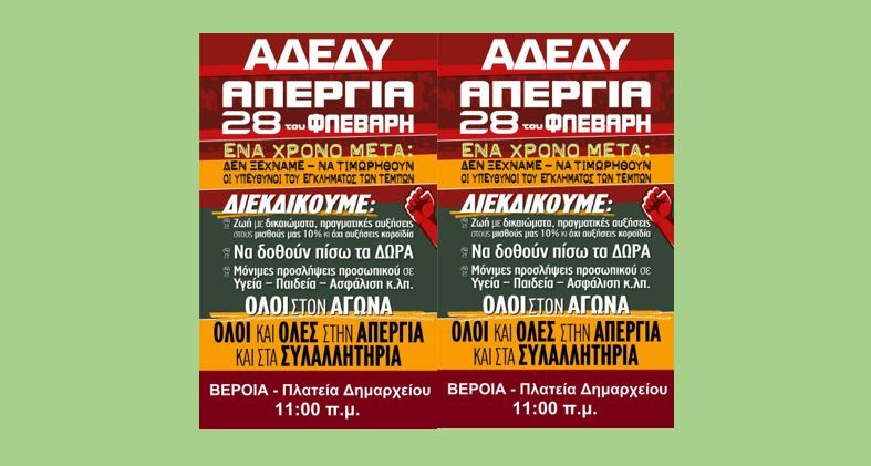 Ν.Τ. ΑΔΕΔΥ Ημαθίας: Όλοι & Όλες στη Γενική Απεργία της 28ης του Φλεβάρη / συγκέντρωση, Βέροια Πλατεία Δημαρχείου