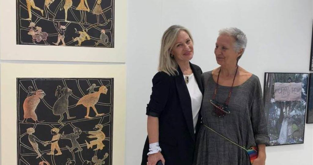 Δήμητρα Σιατερλή & Βίκυ Παπατζίκου με φόντο τα έργα της /Art-Athina-2022 – Ζάππειο-Μέγαρο