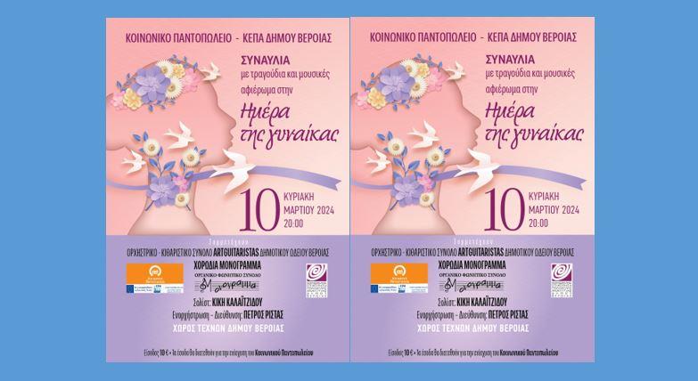 Το Κοινωνικό Παντοπωλείο σε συνεργασία με την Κ.Ε.Π.Α Δήμου Βέροιας παρουσιάζουν συναυλία με Τραγούδια αφιερωμένα στη γυναίκα την Κυριακή 10 Μαρτίου 2024, ώρα 8:00μ.μ. στο Χώρο Τεχνών Δήμου Βέροιας. Η είσοδος είναι 10€ και όλα τα έσοδα θα διατεθούν για τις ανάγκες του Κοινωνικού Παντοπωλείου.