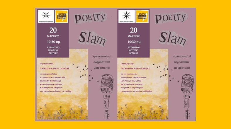 Κάθε χρόνο, στις 21 Μαρτίου, φορείς και συλλογικότητες οργανώνουν εκδηλώσεις για να τιμήσουν την Παγκόσμια Ημέρα Ποίησης. Φέτος, η Εφορεία Αρχαιοτήτων Ημαθίας και η Δημόσια Κεντρική Βιβλιοθήκη Βέροιας συνδιοργανώνουμε μια δράση αφιερωμένη στη Slam Poetry, τη σύγχρονη δυναμική προφορική ποίηση. Καλούμε το εφηβικό μας κοινό να εκφραστεί ποιητικά και να ερμηνεύσει προφορικά ιδέες, προβληματισμούς, όνειρα και πάθη.