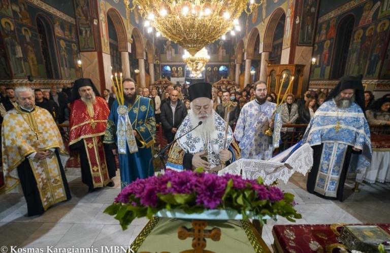 Ακολούθως τελέστηκε η Α´ Στάση των Χαιρετισμών της Υπεραγίας Θεοτόκου χοροστατούντος του Σεβασμιωτάτου Μητροπολίτου μας κ. Παντελεήμονος, ο οποίος κηρύττοντας τον θείο λόγο εξέφρασε τις ευχαριστίες του προς τον Σεβασμιώτατο Μητροπολίτη Μυτιλήνης, Ερεσού και Πλωμαρίου κ. Ιάκωβο, για την άδεια και την ευλογία της μεταφοράς των Ιερών Λειψάνων, αναφέροντας μεταξύ άλλων: «Δύναμις τοῦ Ὑψίστου ἐπεσκίασε τότε πρός σύλληψιν τῇ Ἀπειρογάμῳ».