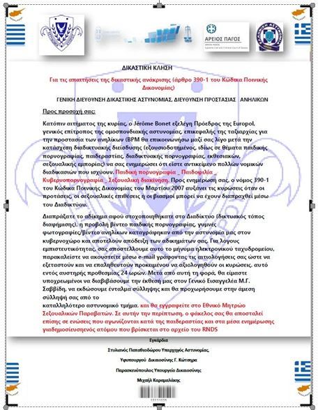 Στο πλαίσιο αυτό ανακοινώνεται ότι, το παρακάτω κείμενο – μήνυμα που διακινείται μέσω ηλεκτρονικού ταχυδρομείου (email), ως δήθεν επιστολή αξιωματούχων της Ελληνικής Αστυνομίας ή άλλων ευρωπαϊκών και διεθνών οργανισμών, με αναφορά σε υπηρεσίες της Ελληνικής Αστυνομίας («Γενική Διεύθυνση Δικαστικής Αστυνομίας», «Διεύθυνση Προστασίας Ανηλίκων») είναι καταφανώς ψευδεπίγραφο και απατηλό και αποστέλλεται από δράστες που επιχειρούν προφανώς να εξαπατήσουν – παραπλανήσουν τους πολίτες και ακολούθως να αποκομίσουν παράνομο οικονομικό όφελος.