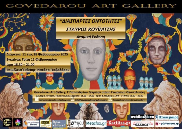 Η Νατάσα Γκοβεδάρου, εικαστικός, curator και ιδιοκτήτρια της Govedarou Art Gallery, διοργανώνει την ατομική έκθεση του εικαστικού Σταύρου Κουϊμτζή με τίτλο ”Διάσπαρτες Οντότητες” στο χώρο της γκαλερί στη Γ.Παπανδρέου 5. Τα εγκαίνια θα γίνουν την Τρίτη 11 Φεβρουαρίου και θα διαρκέσει έως τις 28 Φεβρουαρίου. Οι ”Διάσπαρτες Οντότητες” μέσα από τα μάτια του Σταύρου Κουϊμτζή: “Αέναη η ύπαρξη του ανθρώπου πάνω στη γη με στόχο την επιβίωση, την ανέλιξη, την προβολή, την κατάκτηση.