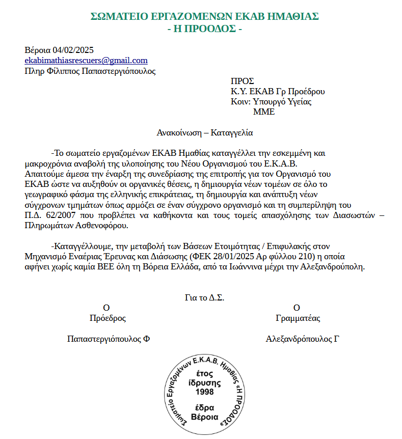 Από το σωματείο εργαζομένων ΕΚΑΒ Ημαθίας πήραμε το ενημερωτικό δελτίο που ακολουθεί: