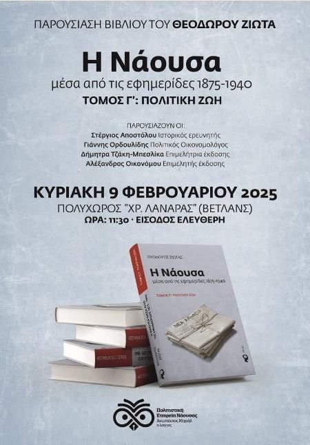 Με ιδιαίτερη χαρά και περηφάνια η Πολιτιστική Εταιρεία Νάουσας «Αναστάσιος Μιχαήλ ο λόγιος» παραδίδει στους συμπολίτες μας, αναγνώστες και φίλους της ιστορίας, τον τρίτο τόμο του έργου του Θεόδωρου Ζιώτα «Η ΝΑΟΥΣΑ ΜΕΣΑ ΑΠΟ ΤΙΣ ΕΦΗΜΕΡΙΔΕΣ/ 1875-1940/ Γ΄ Τόμος/ ΠΟΛΙΤΙΚΗ ΖΩΗ», ολοκληρώνοντας έτσι τη μεγάλη αυτή έρευνα πάνω στη νεότερη ιστορία της πόλης μας.